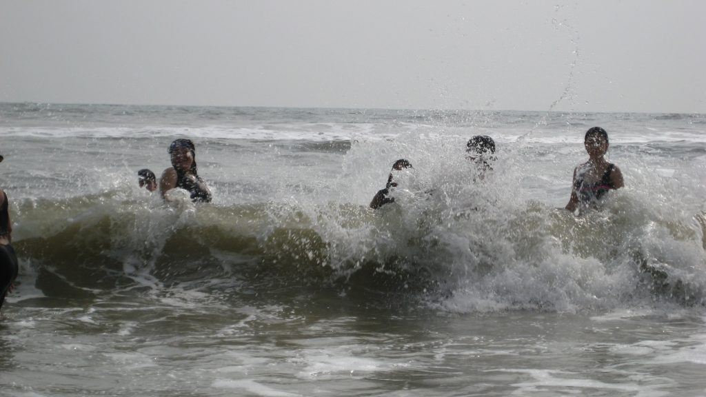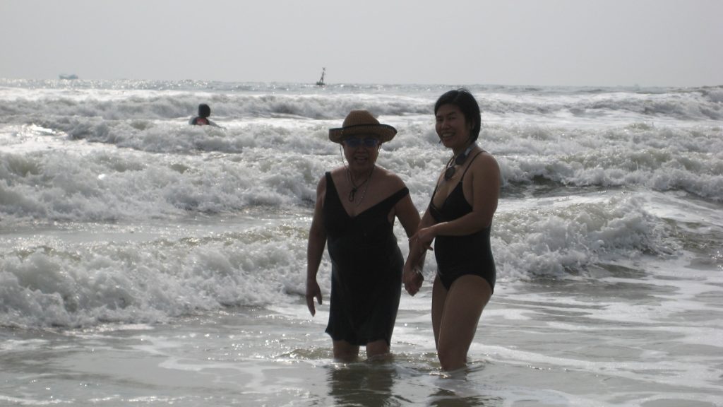 Hôm sau đỡ mệt hơn ra bơi cùng bà ngoại. Sóng lớn và mạnh. Tôi nhớ mãi cảm giác mẹ tôi bám chắc lấy tay tôi mỗi khi sóng tiến sát. Cái bám đầy tin cậy, không thả suốt buổi bơi. Thỉnh thoảng sóng mạnh quá Bà loạng choạng kéo tôi xuống, rồi lại vừa cười khanh khách vừa đứng dậy đón đợt sóng mới. Phấn khích hồn nhiên như một đứa trẻ đang bám tay mẹ. Tôi chạnh lòng nghĩ đến vài ngày tới, khi tôi lại bỏ Bà ở nhà một mình đi tới nơi xa tắp. Tuy sống cùng chồng, Bà không tìm được sự an ủi cảm thông ở ông. Tôi giống tính bố tôi nhiều, tương đối độc lập và ít phụ thuộc tình cảm. Nên tôi thấy tương đối yên tâm về Ông. Trong khi đó mẹ tôi có vẻ quyến luyến con cái nhiều. Nên tâm tôi hay trĩu nặng khi nghĩ về Bà, nghĩ về hoàn cảnh sống xa con cái của Bà.