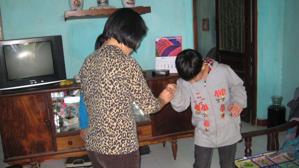 Tí đeo các huân chương của ông, rồi cúi đầu hôn tay mẹ. Không hiểu nó nghĩ ra cái chuyện cúi đầu hôn tay từ đâu ? Phim ảnh ?
